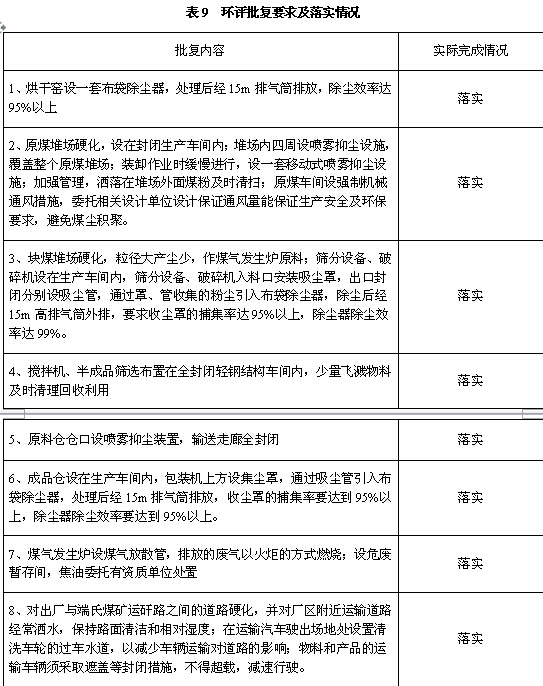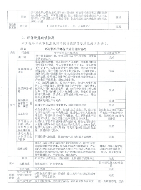 2016年9月委托晉城市綠和環(huán)保技術(shù)咨詢有限公司編制了《沁水縣誠友型煤有限公司年產(chǎn)10萬噸型煤項目環(huán)境影響報告表》,報告表中要求的主要環(huán)保措施及落實情況如下: