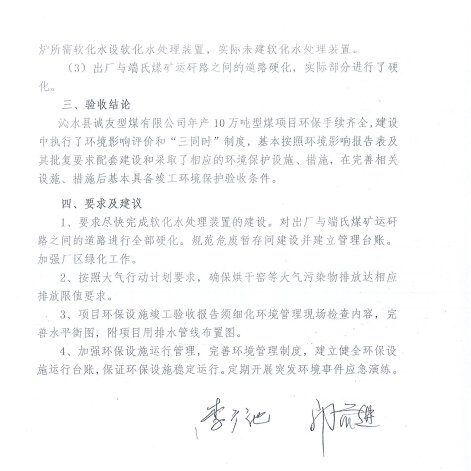 綜上所述,沁水縣誠友型煤有限公司在建設(shè)過程中已基本落實了環(huán)評及其批復(fù)要求,符合驗收條件和要求,可以予以驗收。